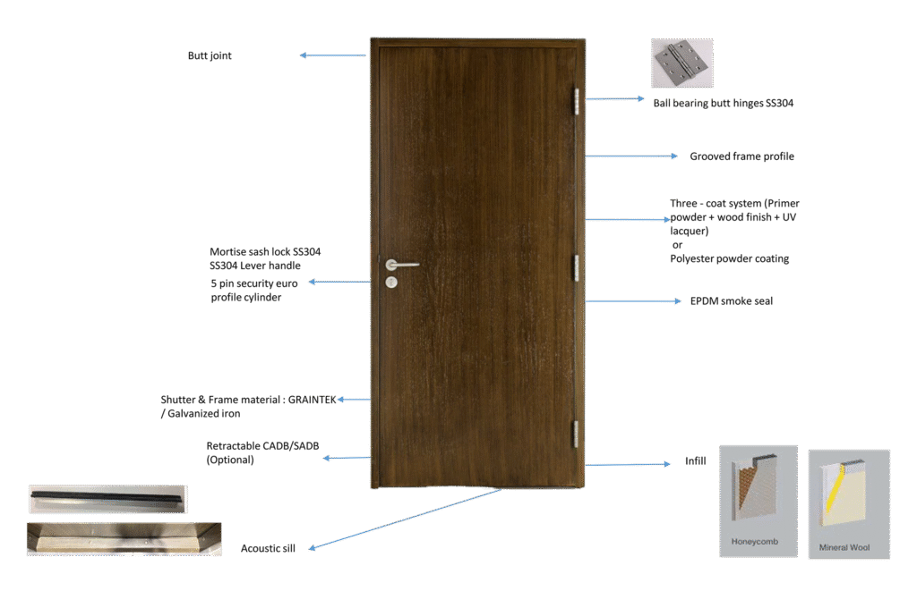 Our acoustic doors can also give protection to the property meeting the dual requirement of fire and sound as a combination of the door assembly.
