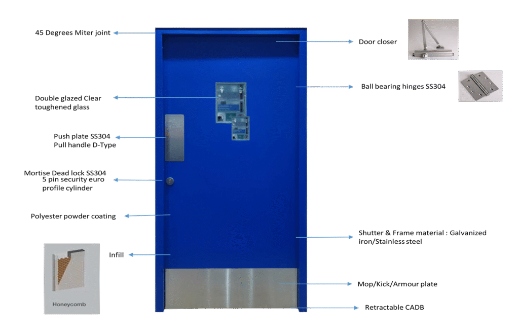 Clean room doors comes with integrated sealing system and in multiple materials like stainless steel and galvanized steel to meet stringent material specification. Since the application of clean rooms for various process are vital to the very establishment, due consideration needs to be taken for doors material, thickness finish as they may be exposed to various environment and constant cleaning.