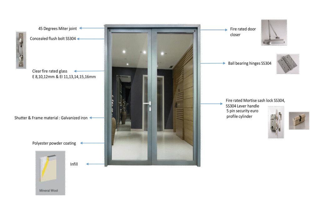 These doors not only protect the property and lives, but also add significant value to the visual aesthetic of the buildings. Tested and certified to comply with the Indian Standard (IS 3614) and International standards (BS 476) these doors are factory-finished in polyester powder coated and offered in a wide range of finishes.