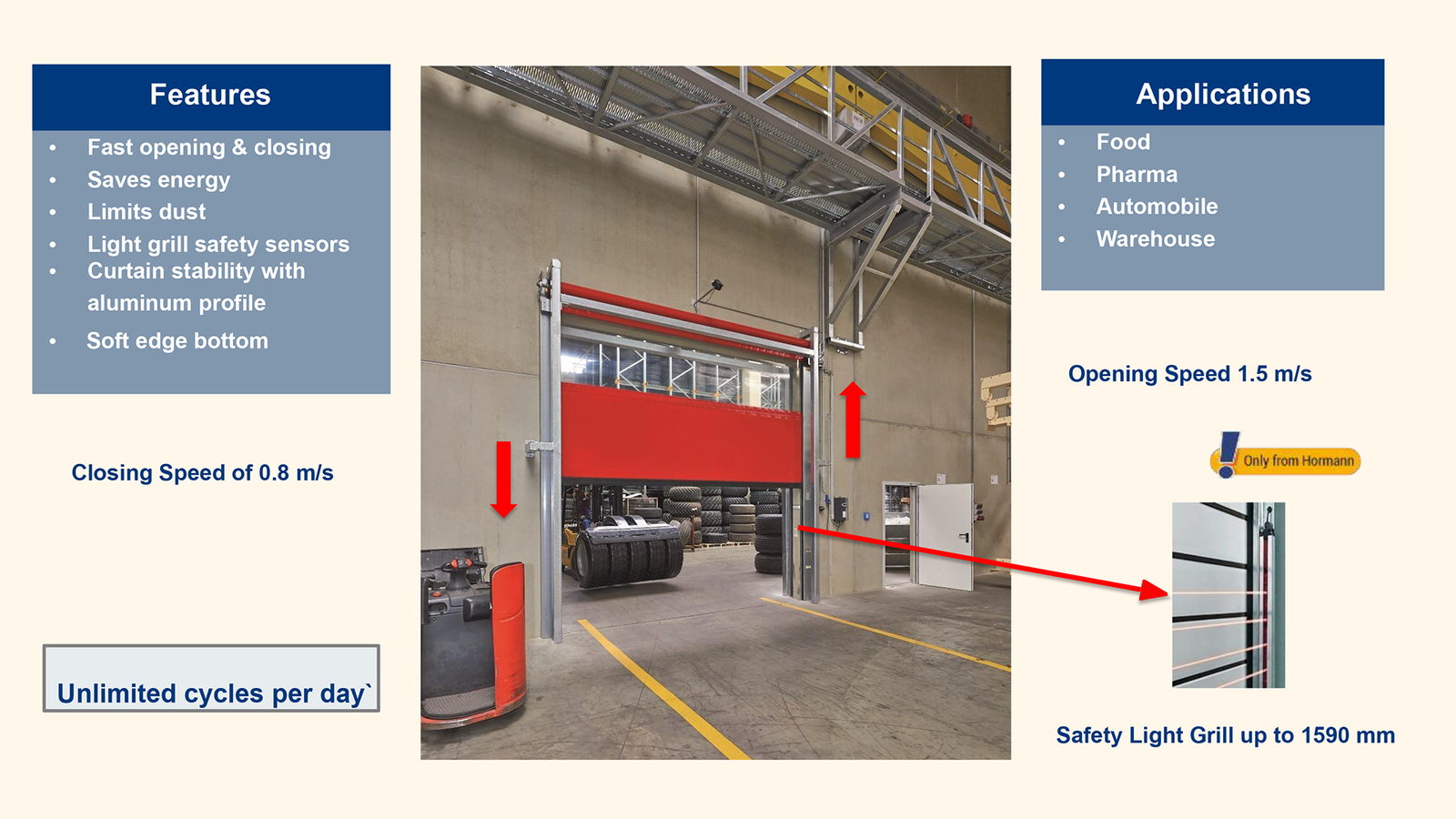 Thanks to the high opening and closing speeds, energy losses on the door as well as draughts at the workplace are noticeably reduced resulting in a better work environment.